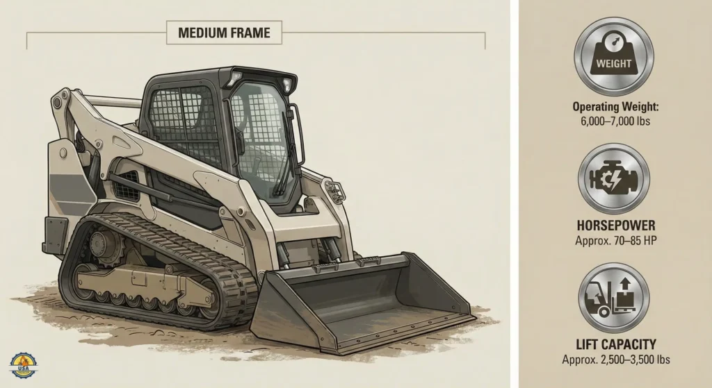 - Medium-frame skid steers: ~2,720–3,175 kg