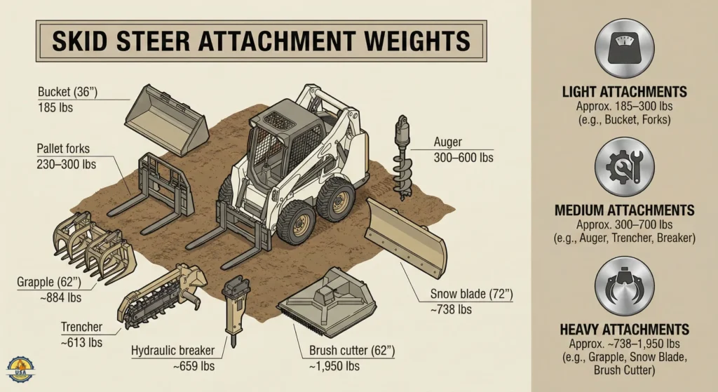 Attachments are included in operating weight and directly reduce available lift capacity.