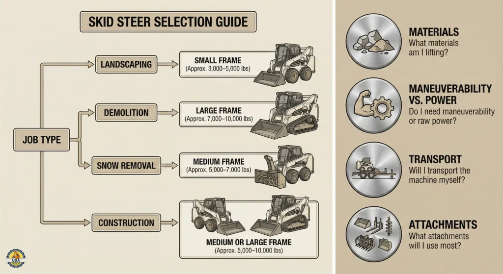Skid steers are commonly grouped into small-frame, medium-frame, and large-frame categories. Larger machines weigh more, lift more, and require more space and transport capacity.