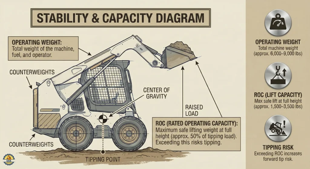 Operating weight is different from how much a skid steer can lift. That lifting ability is defined by a separate metric called Rated Operating Capacity (ROC).