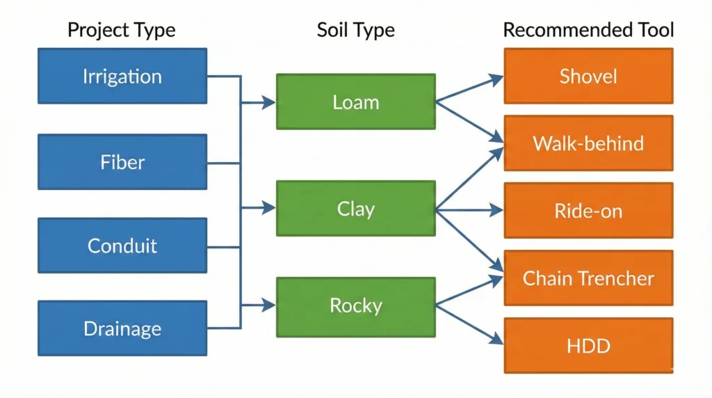 - Ground type: Turf, loam, clay, or rocky soil impacts tool choice — soft soil favors walk-behind trenchers; rock favors wheel trenchers or excavators.