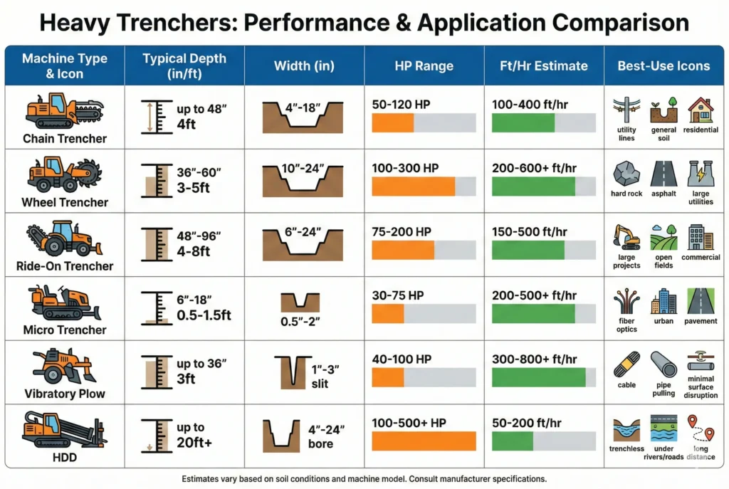 | Chain trencher | 400–2000 ft/hr | Utility mains |