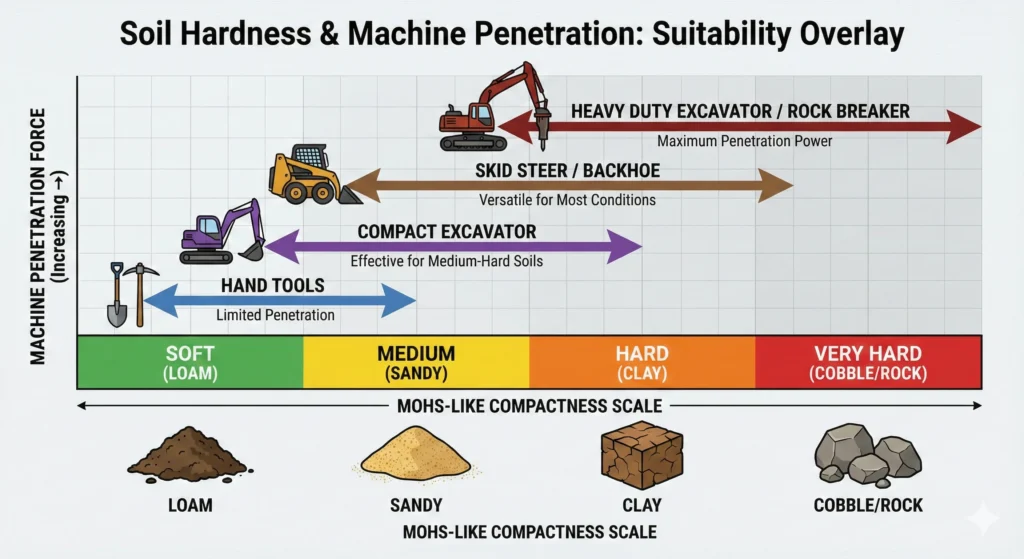 - Soft soil → walk-behind; rocky → saw/excavator.