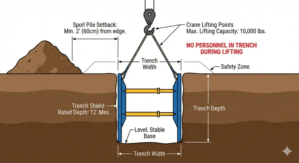 - Spoil Piles: Excavated soil and heavy equipment must be kept at least 2 feet back from the trench edge to prevent roll-in.