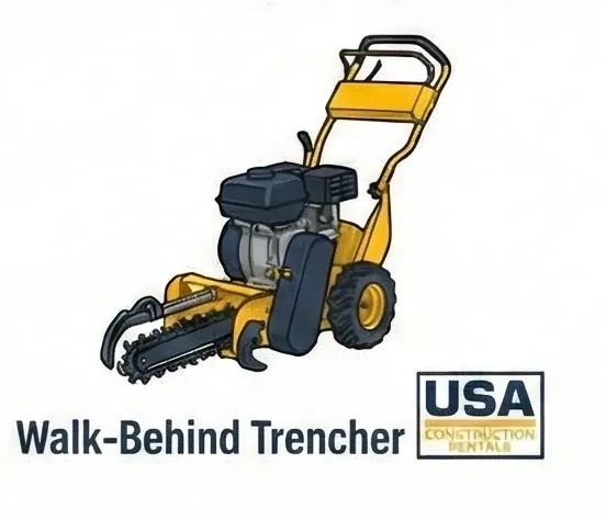 Walk-Behind Trenchers These are the standard rental units. They use tracks or wheels to pull a digging chain. They handle irrigation lines and cables easily, digging up to three feet deep.