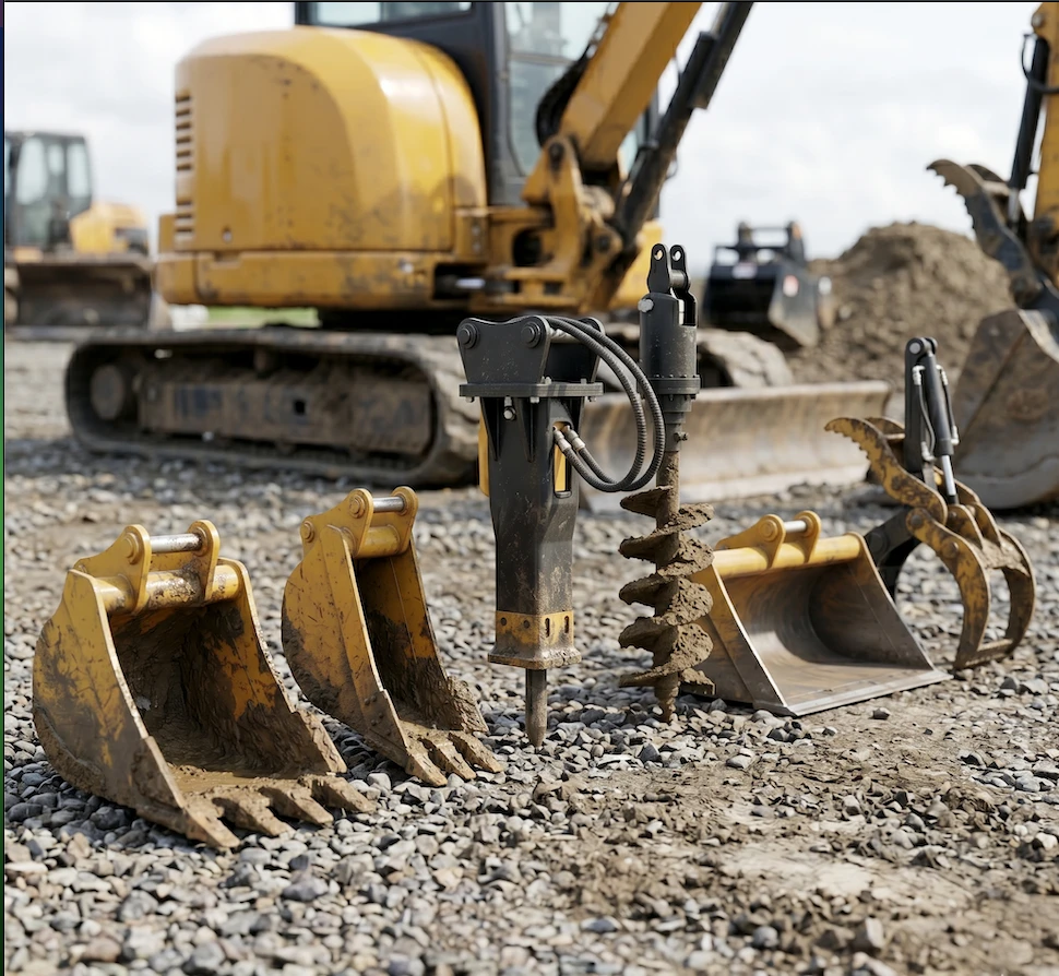 Common attachments available with mini excavator rentals may include standard buckets for general digging, trenching buckets for narrow excavation work, hydraulic breakers for concrete and demolition tasks, augers for drilling holes, grading buckets for leveling and finishing surfaces, and thumb attachments for handling debris, rocks, logs, and heavy materials more efficiently.